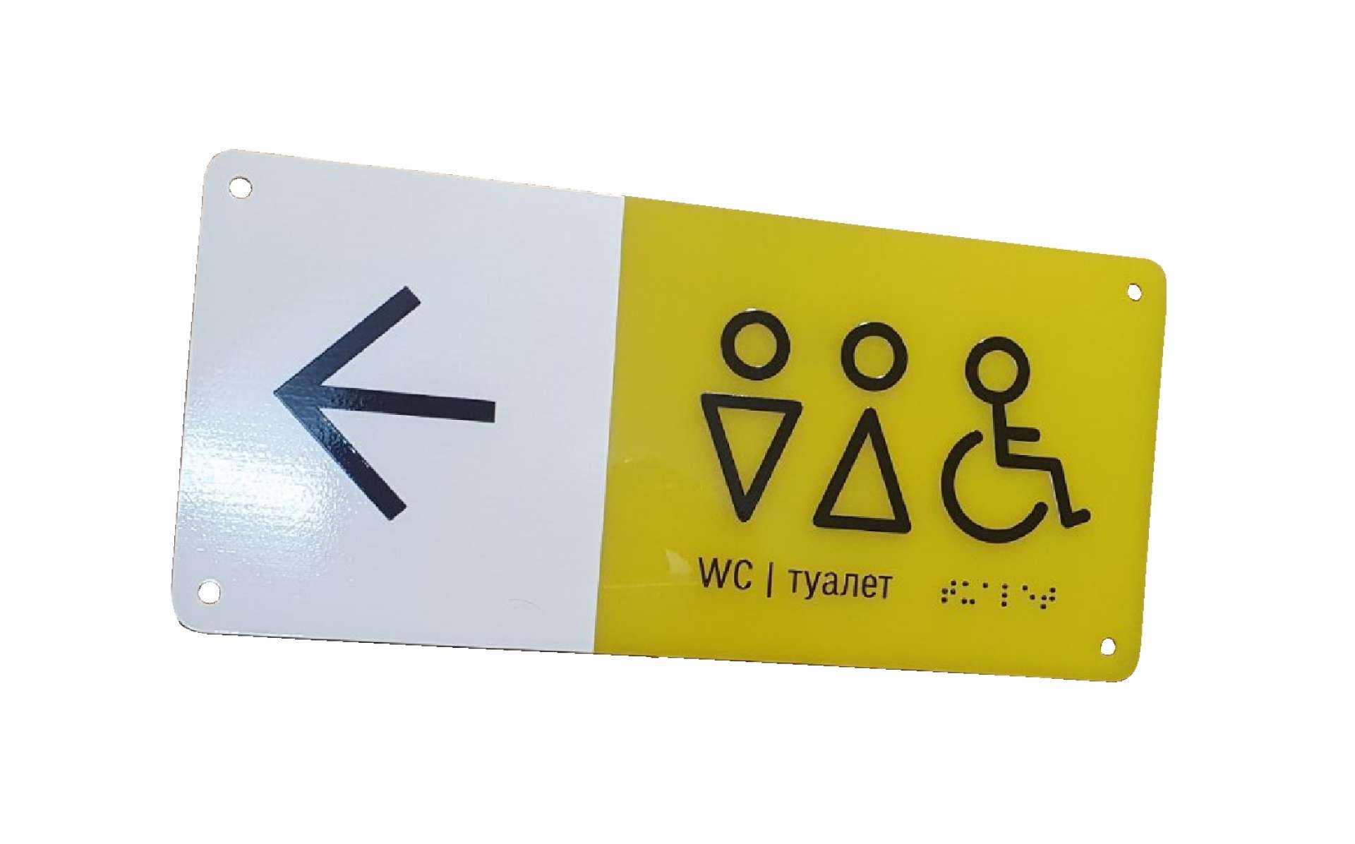 Желтая акриловая табличка со шрифтом Брайля небольшого размера. Производится со специальным шрифтом для людей с ограниченными возможностями. Применяется магазинами, аптеками, государственными учереждениями при входе в помещение.