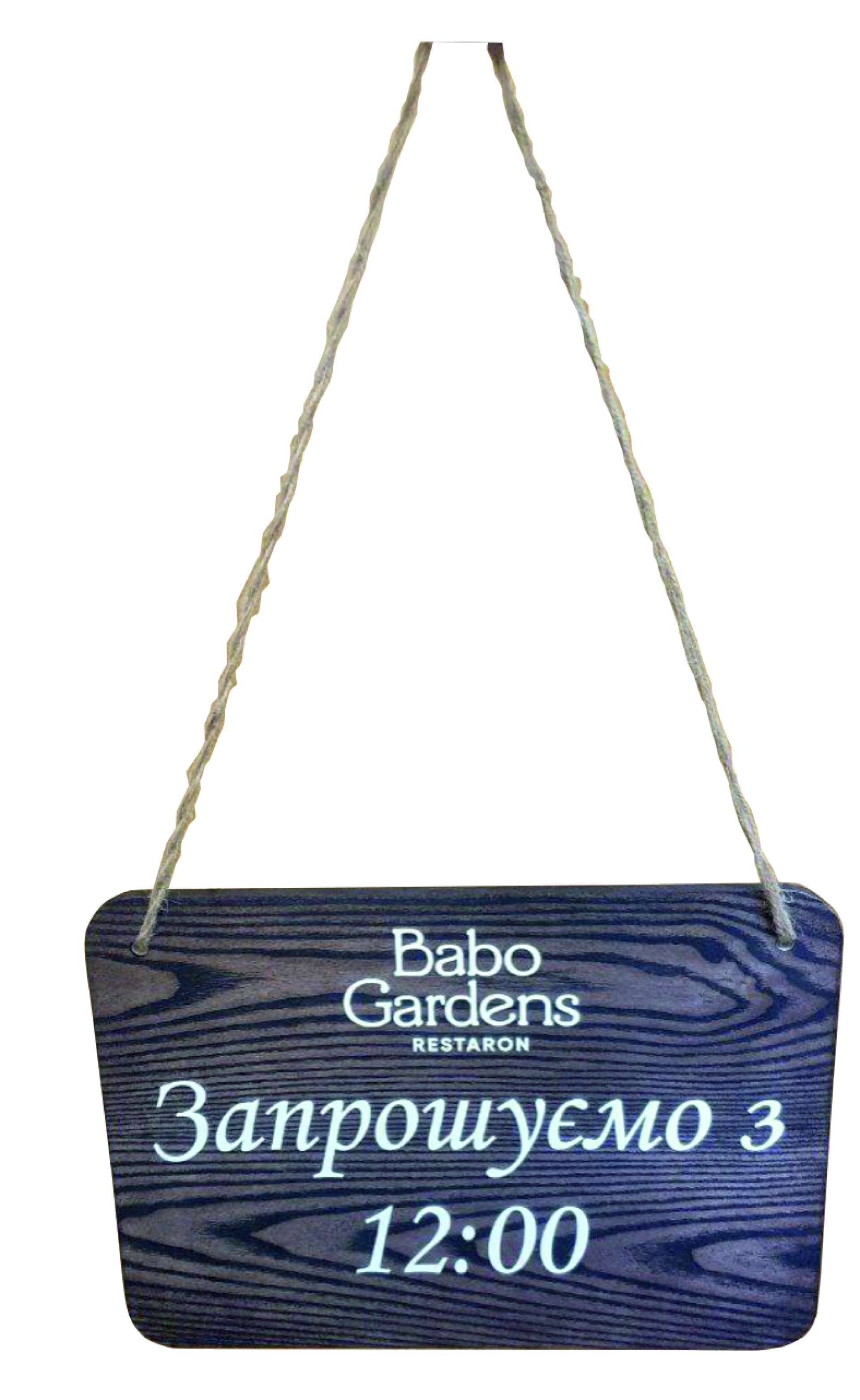 Деревянная табличка из качественного дерева (Ясень) окрашена и нанесен текс. Текст сделан краской или глубоким фрезерованием. Табличка толщиной 15–20 мм на веревке.