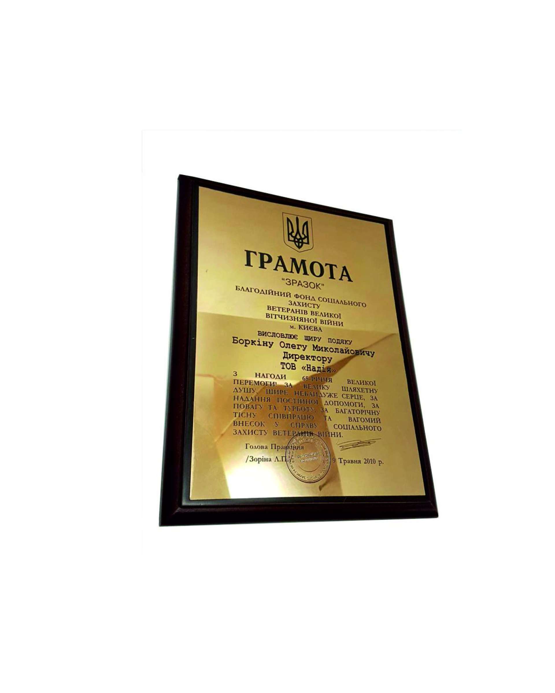 Грамота на золотистом пластике с деревянной подложкой в Днепре.