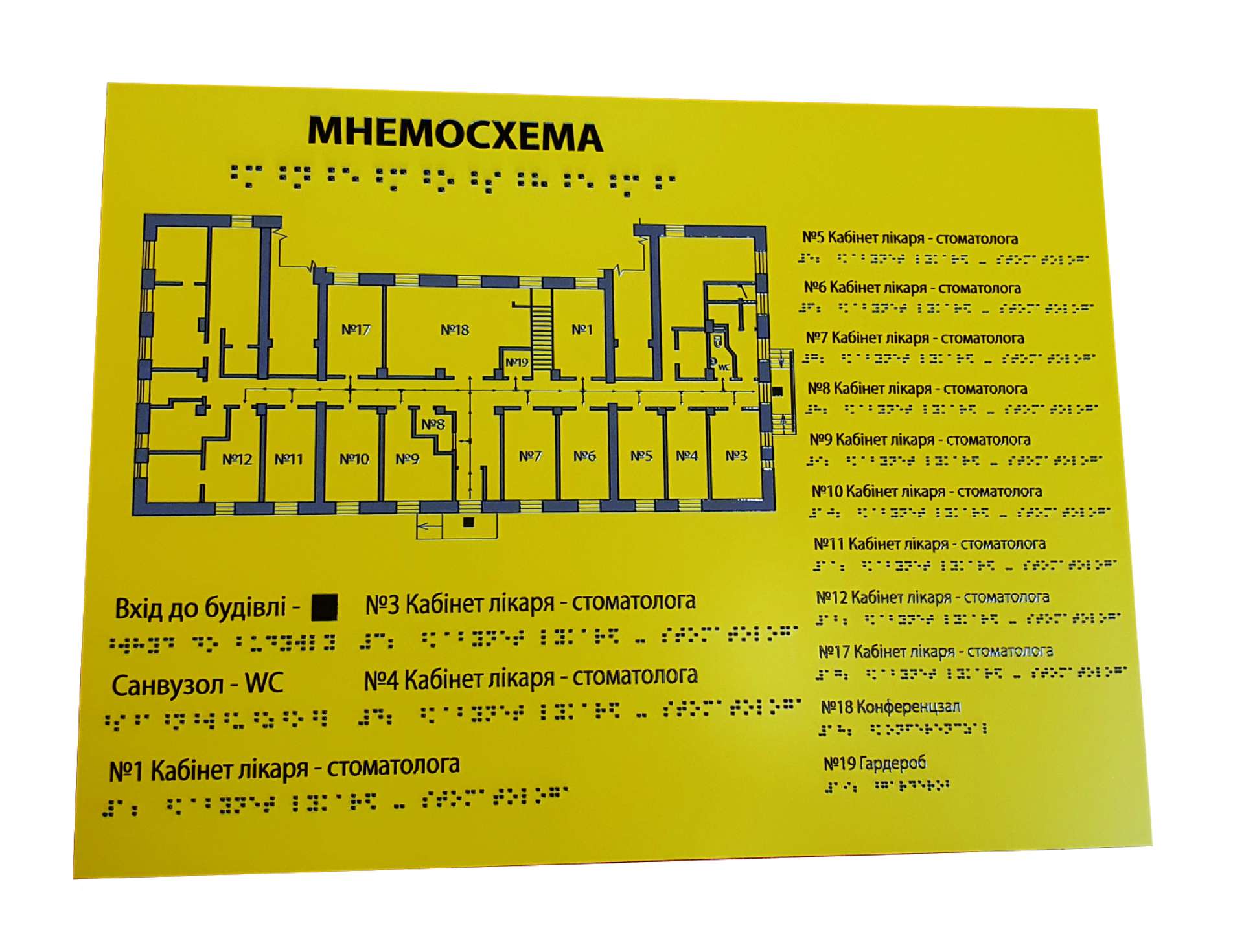 Тактильная мнемосхема нужна для того, чтобы посетитель смог на ощупь, как по карте, двигаться внутри помещения в кабинеты и обратно, а также в случае эвакуации. Табличка со шрифтом Брайля на композите. Изготовлена по техническому стандарту с выпуклым шрифтом брайля. Изготовление любого размера в Днепре